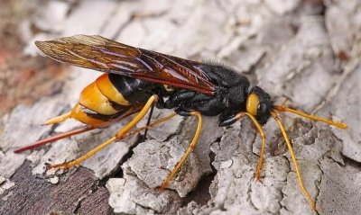 形態(tài)特征成蟲泰加大樹蜂雌成蟲 體長20.2-34.1mm,翅展34.1-54.2mm,圓筒形,黑色有光澤。頭胸部密布刻點(diǎn),僅頰和眼上區(qū)刻點(diǎn)...