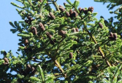 形態(tài)特征紫果云杉紫果云杉為喬木,最高可達(dá)50米,胸徑達(dá)1米;樹皮深灰色,裂成不規(guī)則較薄的鱗狀塊片;大枝平展,樹冠尖...